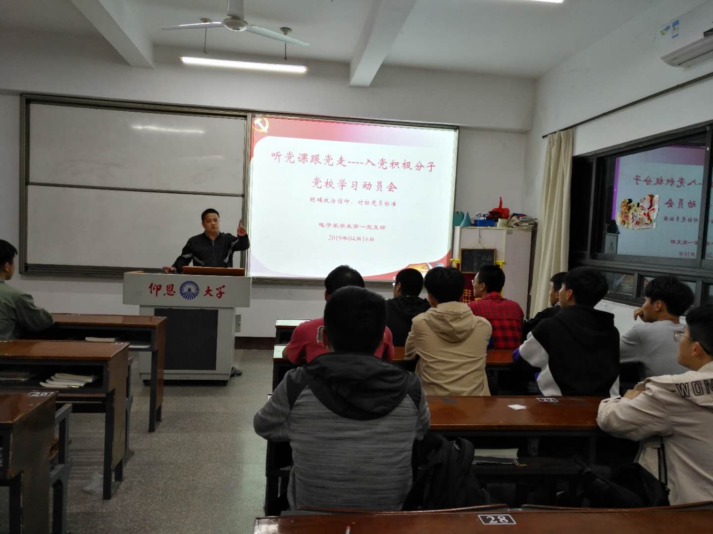 电子系学生第一党支部积极分子党课培训动员大会于2019年4月14日19:00在共和215召开,会议以“听党课跟党走”为主题,出席会议的有党支部书记赵宏岩、电子一支全体干事以及全体参训人员。