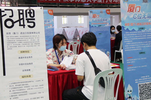 招聘会共吸引了厦门中闽百汇商业有限公司、安踏集团、雨果网(厦门)跨境电商有限公司等55家企业来校招聘,提供了1990余个就业岗位,主要涉及对外贸易、文化传媒、房地产、教育、金融、电子商务、计算机通信等行业领域,与世界杯官网学科专业契合度较高。