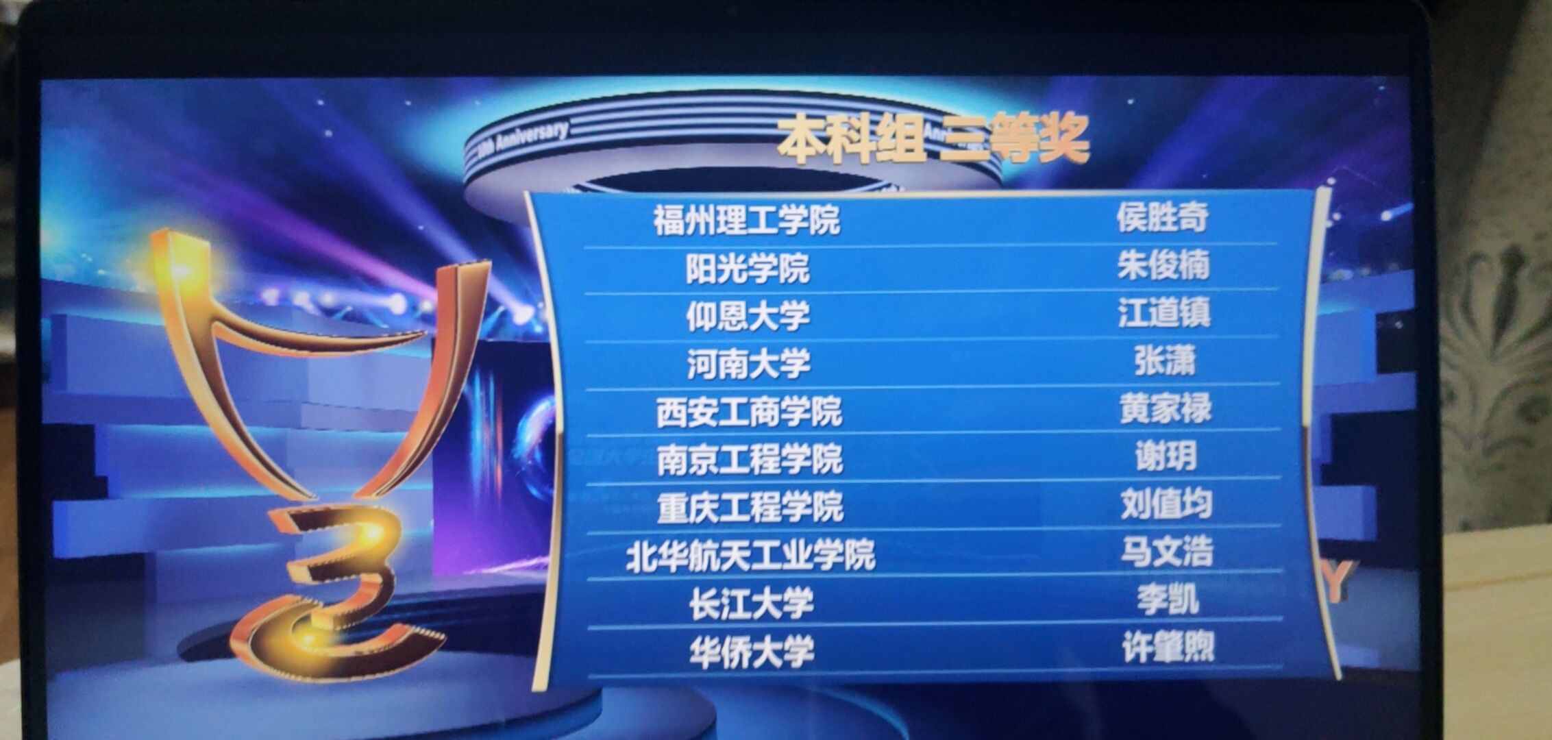 2020年12月5日,“新华三杯”全国大学生数字技术大赛决赛在泉州信息工程学院举办。经过预赛选拔,世界杯官网共有3名同学(江道镇、陈鑫、严钟灵)进入决赛,江道镇同学在本次比赛中荣获三等奖,陈鑫、严钟灵同学荣获优胜奖。