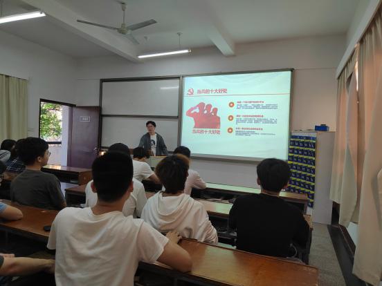 本次班会分别从国防的意义、征兵入伍条件要求、当兵的十大好处、应征入伍的基本流程、退役士兵的优惠政策等多方面进行了详细的解读。通过观看宣传视频,同学们进一步感受到了军人强健的体魄和沸腾的热血,深刻领悟了军队对于国家的重要性。同学们更加深入了解了征兵的流程与意义,明确未来人生方向。