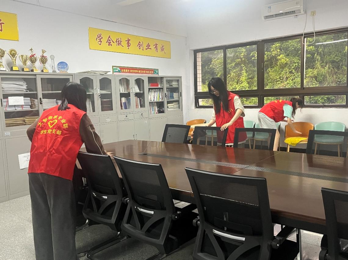 入党积极分子身着统一的志愿者服装,分工明确,配合默契。他们手持扫帚、拖把、抹布等清洁工具,对会议室的每一个角落进行了彻底地清理。这次打扫活动不仅提升了办公室环境的整体美观度,也为即将召开的各类会议创造了更加舒适、专业的环境,充分体现了入党积极分子们“从小事做起,从身边事做起”的实践精神。