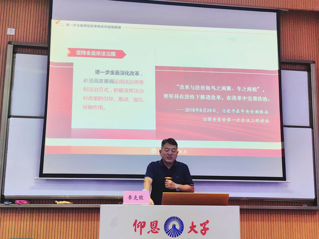 宣讲会在轻松愉快的氛围中拉开帷幕,李克钦教授首先强调了学习贯彻会议精神的重要性和紧迫性,明确了当前和今后一个时期的政治任务。随后,他围绕会议精神进行了全面、深入的解读,从时代背景、主要议程到重大成果,详细阐述了新思想、新论断、新要求,让现场师生对会议精神有了深刻的理解。