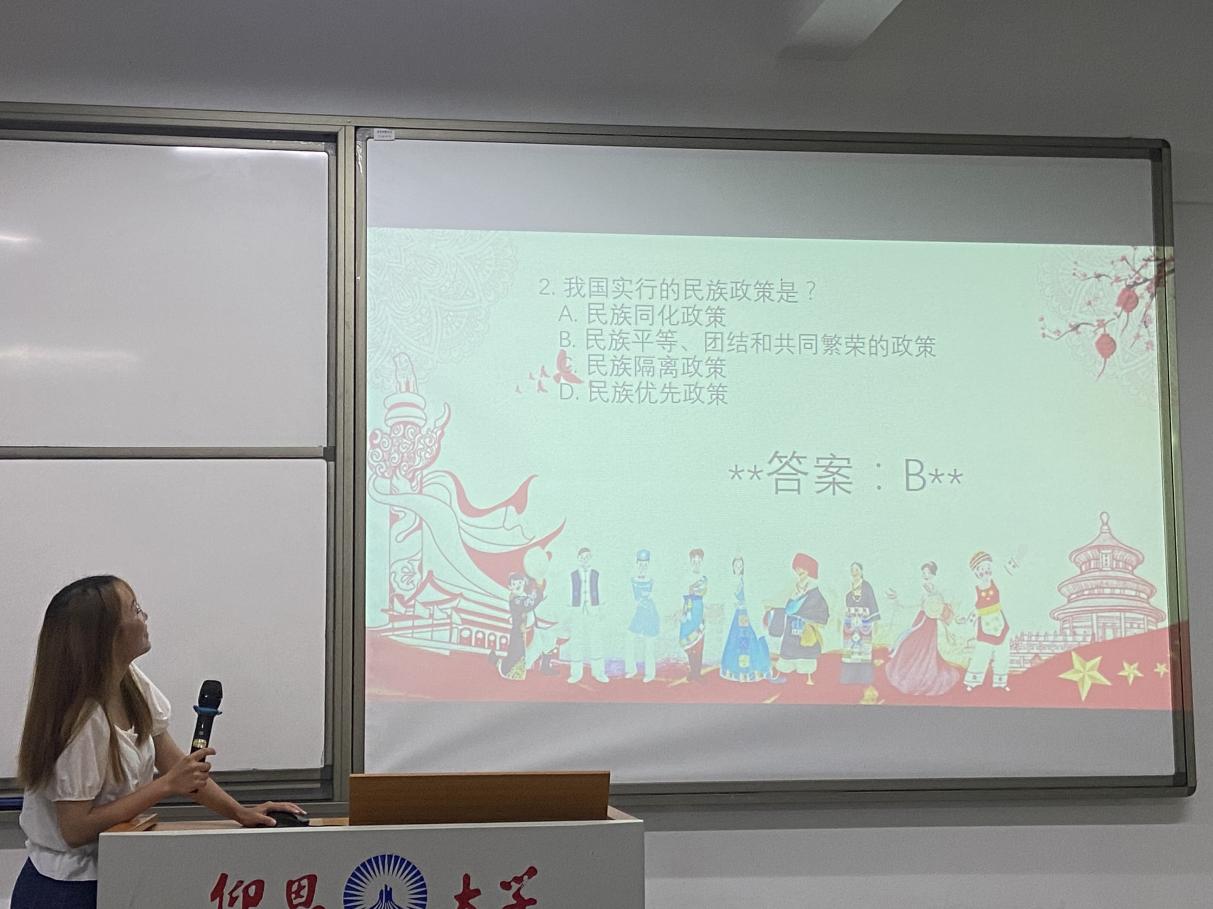 在一片热烈的掌声和期待的目光下,活动正式开始。主持人先向大家介绍一些有关民族团结、民族政策、民族风俗的知识,以增进大家对多民族文化的了解和尊重。随后紧张激烈的民族知识竞赛拉开帷幕,同学们凭借对民族知识的了解,积极抢答,充分展现了他们对民族团结的知识底蕴。在竞赛间隙,来自不同民族的同学分享了各自民族文化特色与团结故事,现场气氛温馨而热烈。最后活动在主持人的精彩结束语中圆满落幕。