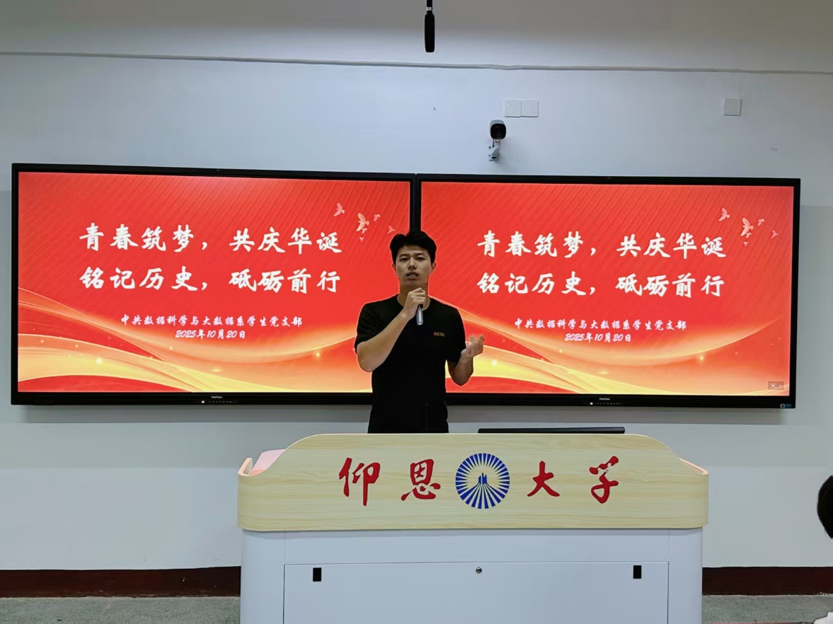 为深入学习习近平总书记在纪念中国人民抗日战争暨世界反法西斯战争胜利80周年大会上的重要讲话精神,铭记历史荣光,凝聚青年奋进力量,值此祖国华诞余温未散、爱国热情持续高涨之际,中共数据科学与大数据系学生党支部于2025年10月20日开展“青春筑梦,共庆华诞 铭记历史,砥砺前行”主题党日活动。通过主题学习的形式,重温抗战历史、感悟精神伟力、展望复兴征程,在思想碰撞中筑牢信仰之基,在初心坚守中明确使命担当。