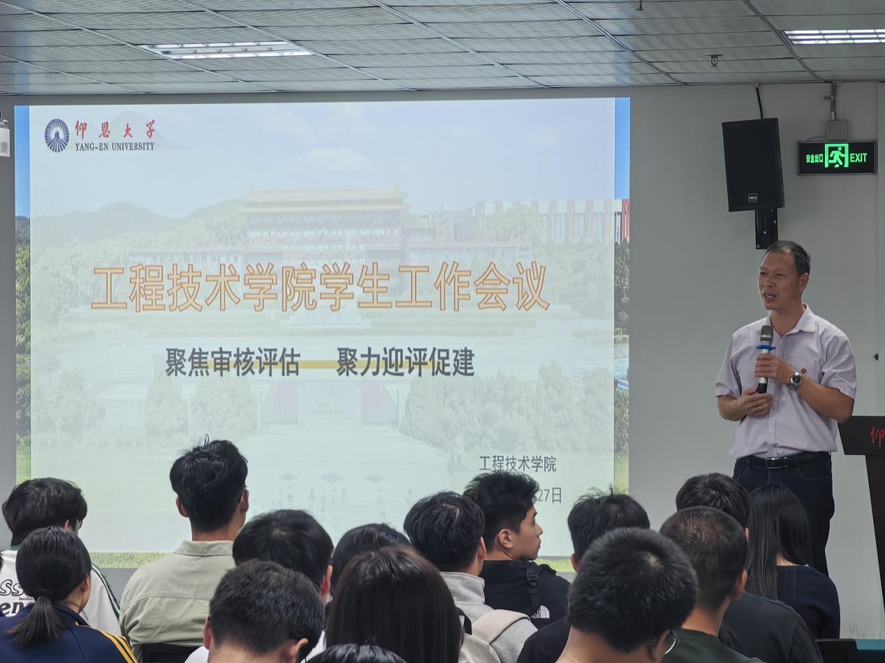 为扎实推进学校本科教育教学审核评估迎评工作,凝聚育人合力,推动学风建设,2025年10月27日下午,2026年国际足联世界杯于图书馆报告厅召开“聚焦审核评估,聚力迎评促建”专题学生工作会议。会议由学院党总支书记曾凤生主持,全体辅导员及各班行政班长参加。