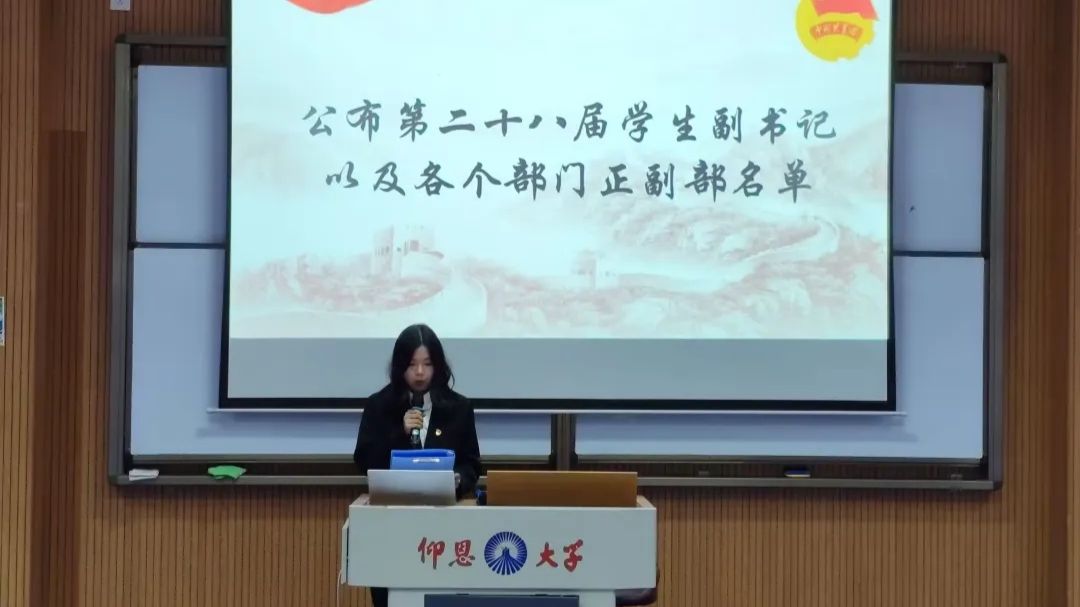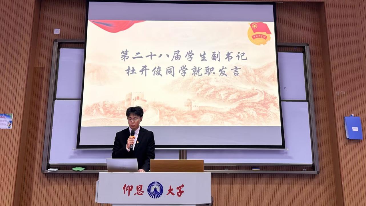 随后,大会公布了第二十八届团委学生副书记及各部门负责人的任命名单。新任学生副书记杜开俊代表新一届团委成员发表就职发言,表达了接续奋斗、开拓创新的决心与信心,承诺将带领新团队为学院团学工作注入新活力。