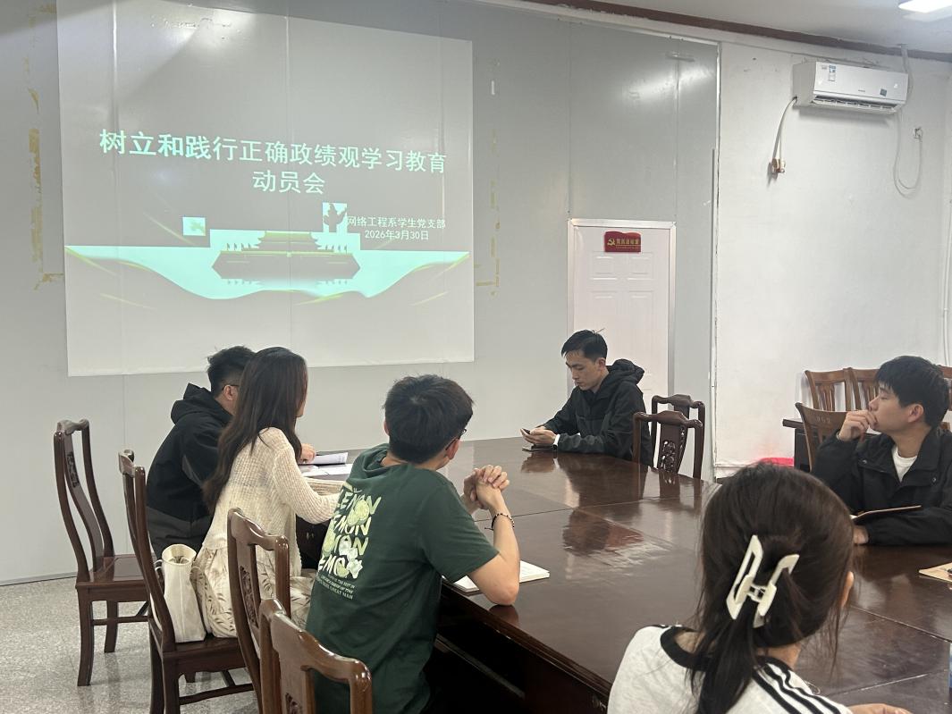 为学习贯彻习近平总书记关于树立和践行正确政绩观学习教育的重要讲话和重要指示精神,引导全体党员坚定理想信念、锤炼党性作风、端正价值追求,切实把思想和行动统一到党中央决策部署上来,2026年03月30日,网络工程系学生党支部在泽钏楼召开树立和践行正确政绩观学习教育动员会。本次会议由党支部书记徐凯迪同志主持,支部全体党员参会。