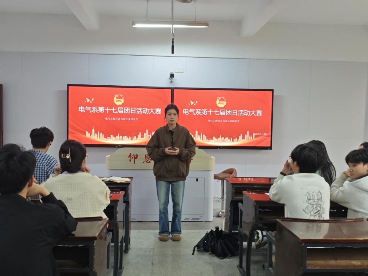 为传承五四精神,厚植青年学子爱国情怀,引导青年团员坚定理想信念、勇担时代使命,2026年4月8日下午,电气工程及其自动化系团总支在仰恩楼A1-107教室成功举办“赓续五四薪火,青春挺膺担当”主题团日活动系赛。电气系团总支书记陈慧敏、电气系团总支第一学生副书记程健凯以及电气系团总支学生干部组成评委团,进行现场评审指导。